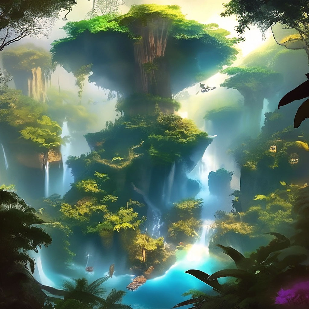 "Magical jungle, where there are flying islands from where the water flows" - im